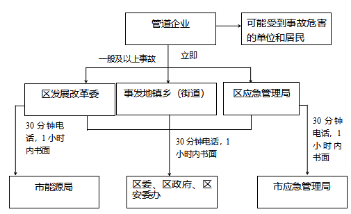 一般及以上天然气长运输管道事故发生后,事发管道企业立即向事发地镇乡(街道)报告,并在1小时内向区发展改革委(联系电线)、区应急管理局报告(联系电线)。区发展改革委、区应急管理局、