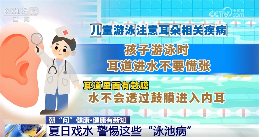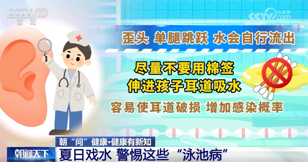 除了皮肤以外,儿童游泳还要格外的注意耳朵的相关疾病。医生提醒,孩子在游泳时,如果耳道进水不要慌张,耳道里面有鼓膜,水是不会透过鼓膜进入内耳的。孩子只要歪头、单腿跳跃,水就会自行流出。家长最好还是不要用棉签伸进孩子耳道吸水,这容易使耳道破损,增加感染概率。