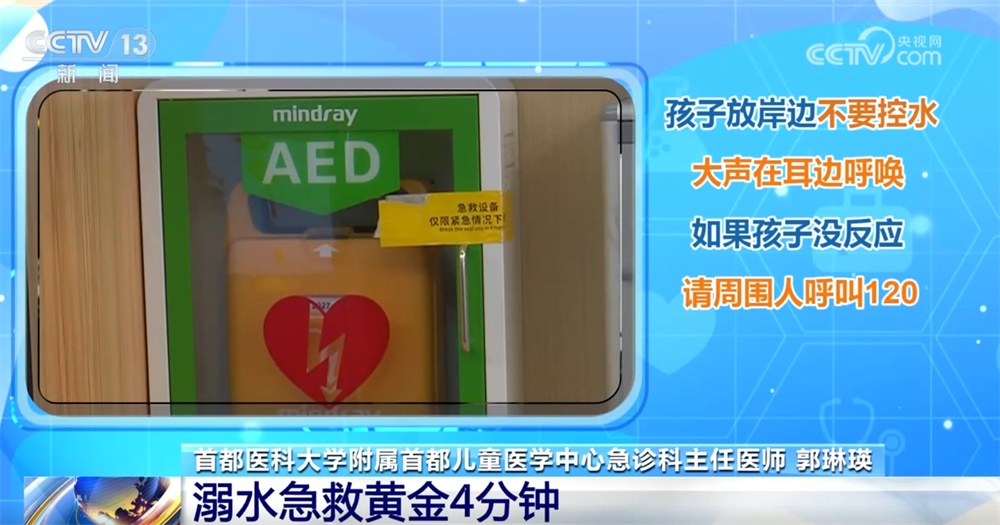 郭琳瑛称:“孩子捞上来之后,放在岸边,绝对不能去控水,大声在他耳边呼唤,假如发现孩子没反应,请周围的人帮助你去呼叫120,拿AED(自动体外除颤器)。同时给孩子摆好,侧过头把嘴里可能呛进去的泥沙、石头这些异物掏出来,然后做2—5次的人工呼吸。假如我们通过通气之后,孩子没有恢复自主呼吸,立即开始做正确的心肺复苏。两连线中间的部分,手掌根部压住,接着进行按压。每分钟按压100—120次,深度要够,绝大多数都是小朋友身体的三分之一,也就是4—5厘米的深度,直到孩子能够恢复自主呼吸和心率。”